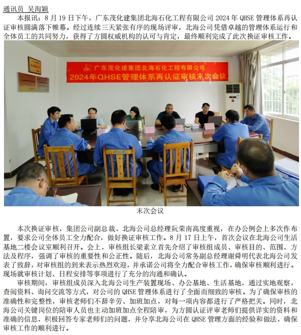 北海公司完成 QHSE 管理體系換證審核工作