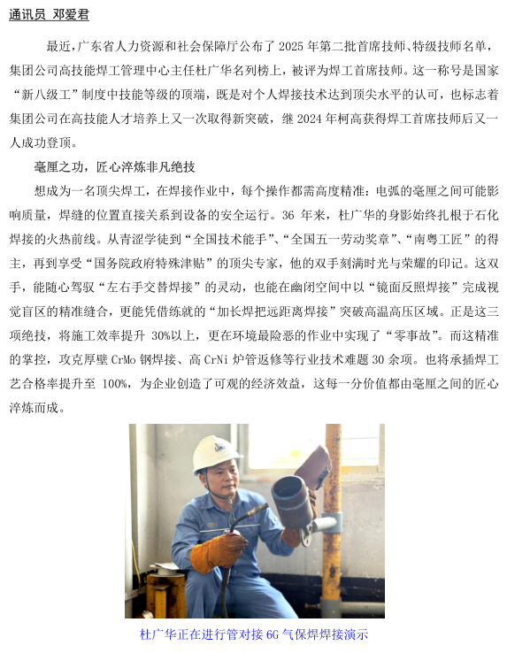 杜廣華被評為焊工首席技師 晉升國家“新八級(jí)工”制度中技能等級(jí)頂端